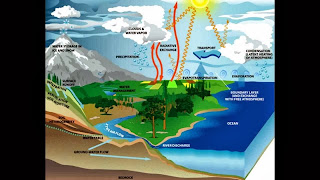 - Evaporasi / transpirasi - Air yang ada di laut, di daratan, di sungai, di tanaman, dsb. kemudian akan menguap ke angkasa (atmosfer) dan kemudian akan menjadi awan. Pada keadaan jenuh uap air (awan) itu akan menjadi bintik-bintik air yang selanjutnya akan turun (precipitation) dalam bentuk hujan, salju, es.